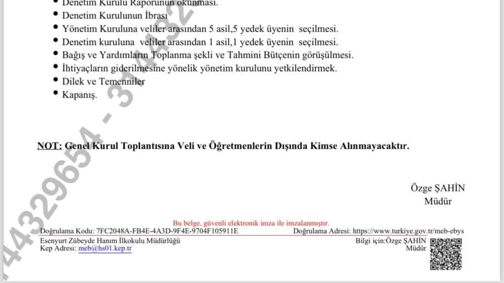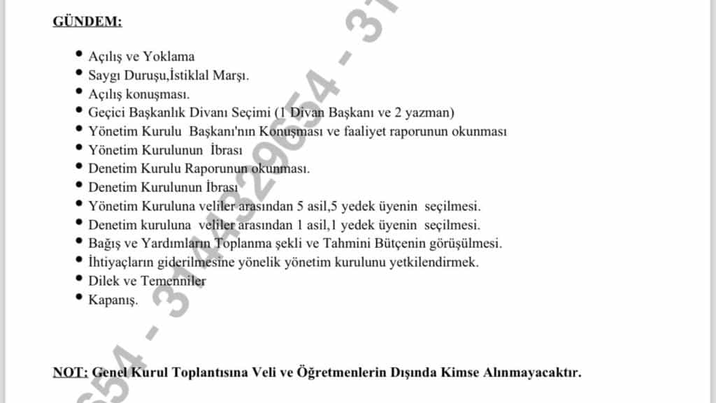 Okulumuz, Okul Aile Birliği Genel Kurulu fotoğrafta belirtilen gündem maddelerini görüşmek üzere toplanacaktır. Toplantıda yeni dönemde görev yapacak Okul Aile Birliği Yönetim Kurulu ve Denetim Kurulu belirlenecektir.
